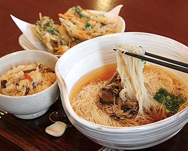 和風だしにきのこの具材たっぷりの「養々麺」(520円)、きのこのかき揚げ、きのこの炊き込み御飯(各100円)。